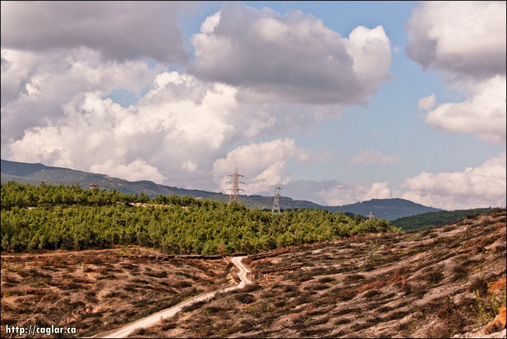 Seyir teraslarından sonra bahar ayında orman içersinden geçtiğimiz yoldan gitmek hüzün vericiydi. Bir zamanlar gps le yolunu işaretlediğim ağaçların kapattığı patikadan hiçbirşey kalmamış. Sahada hızarlar çalışıyorlar, ormandan ne kaldıysa toparlıyorlar. Ağaçların tamamen yanıp kül olmadığını, sadece kabuk ve yaprakları gibi hayati organların yandığını ve böylece öldüklerini farkettim.