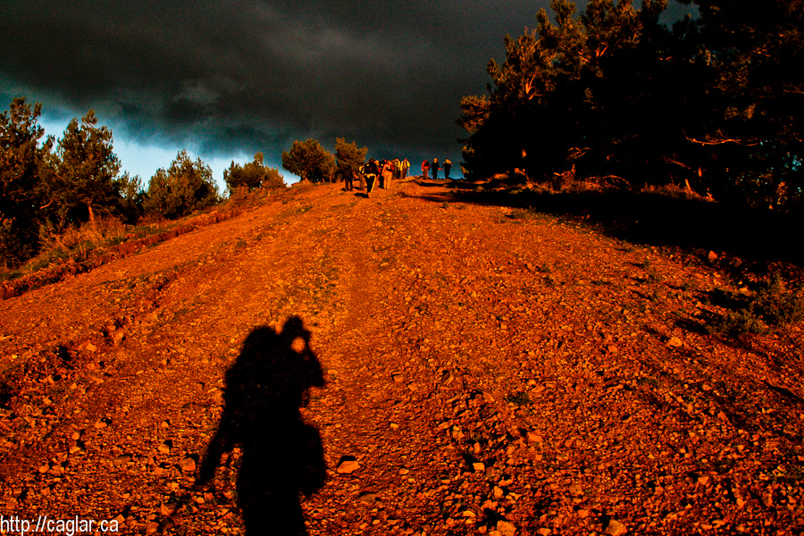 Behzat tepesine ulaştığımızda güneş batmak üzereydi. Yürüyüşlere ilk defa gelenler bu uzun parkurda çok zorluk çekiyorlar. Yürüyüş grubunun hızı gruptaki en yavaş yürüyen kişi kadar oluyor. Öndeki hızlı yürüyenlerin yürüyüşün hızlı olmasına bir faydası olmuyor. Karanlık basmadan güvenli olarak varış yerine ulaşmak gerekli.